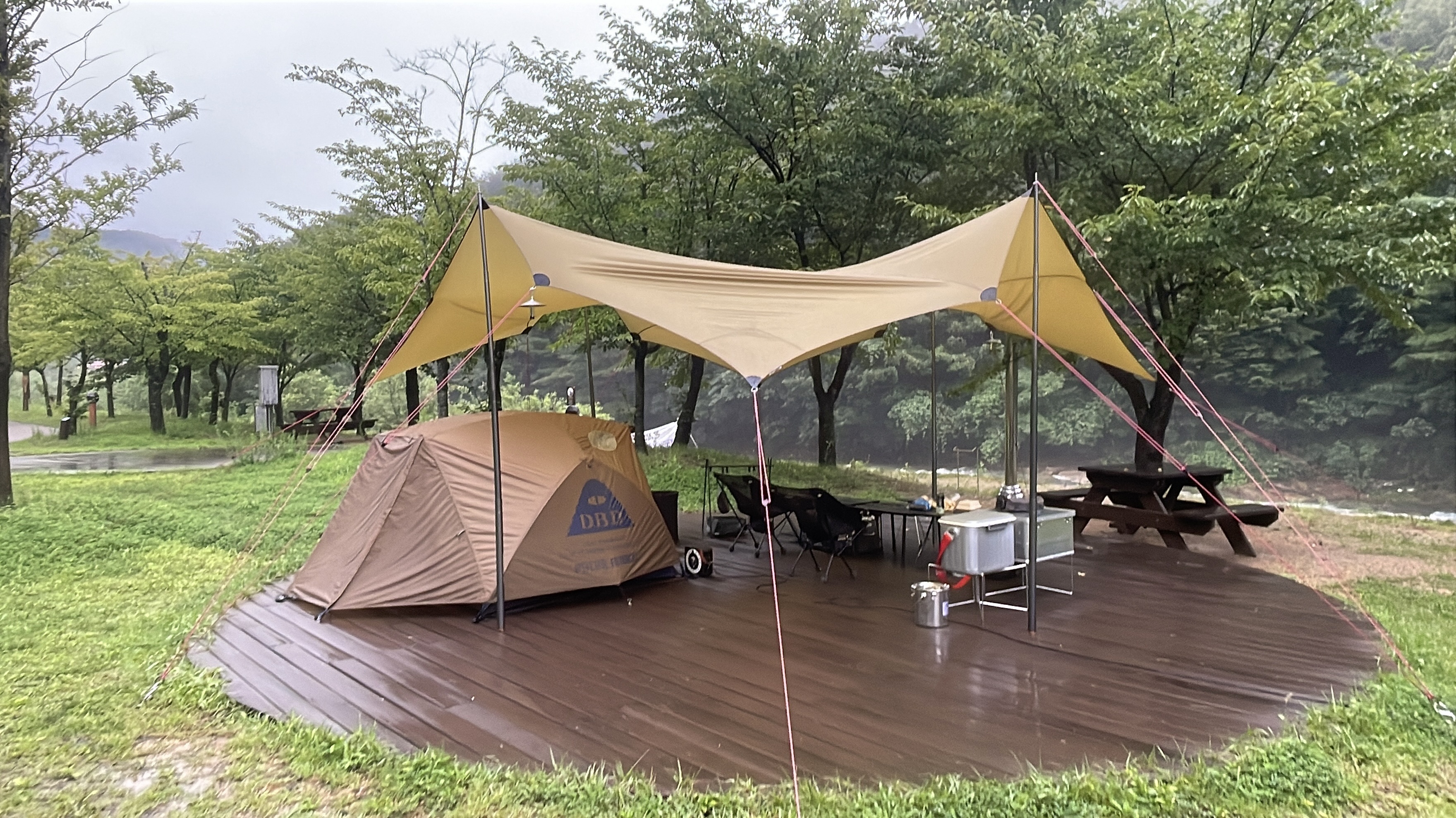 비가 내려도 타프를 혼자 많이 쳐본 탓에 금방 세우고 정리가 되었다.