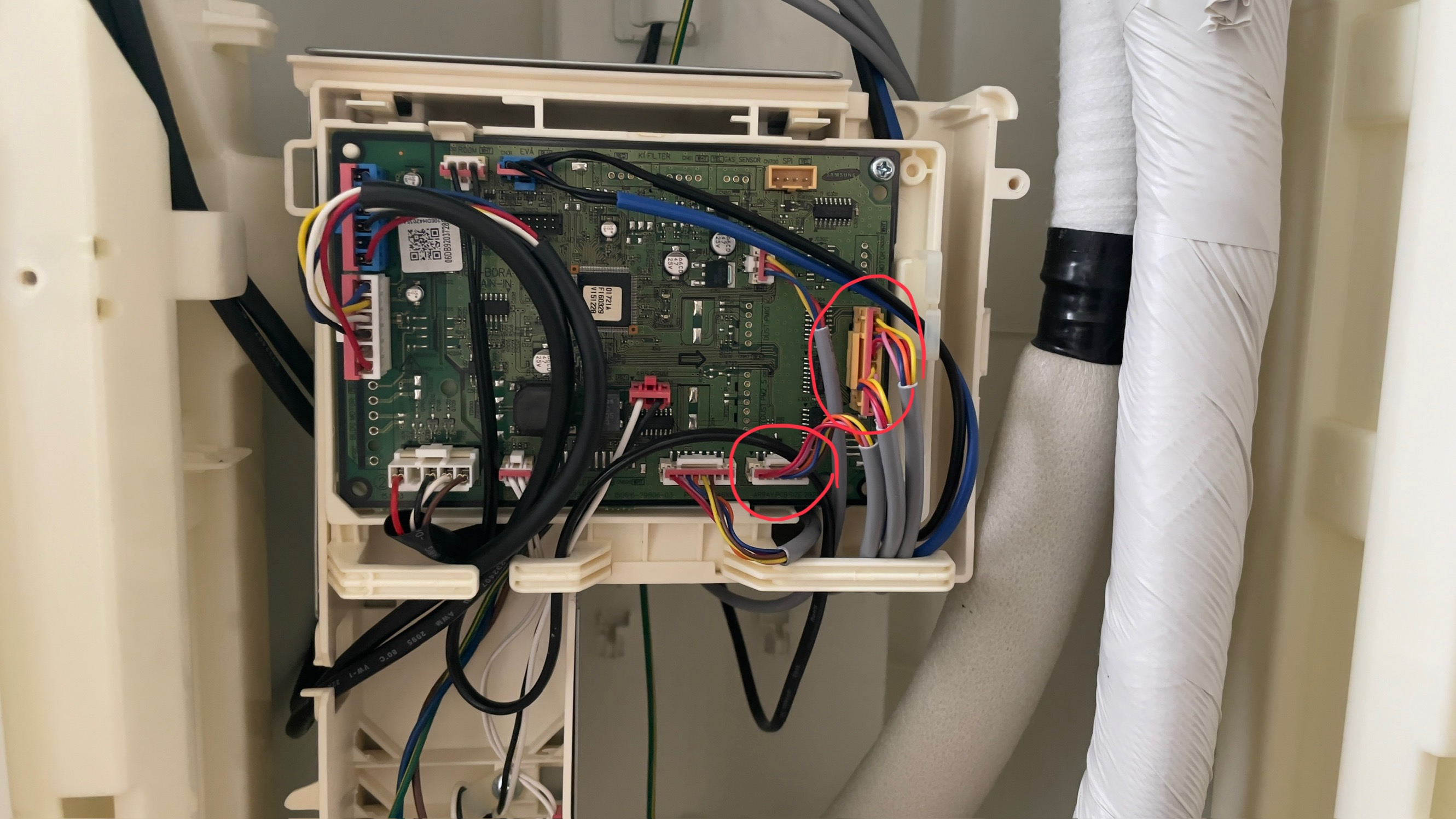 그러면 위와 같이 또 하나의 PCB 기판이 나온다. 거기서 상단 무풍에어컨의 본체와 연결된 하네스를 찾아 분리한다.